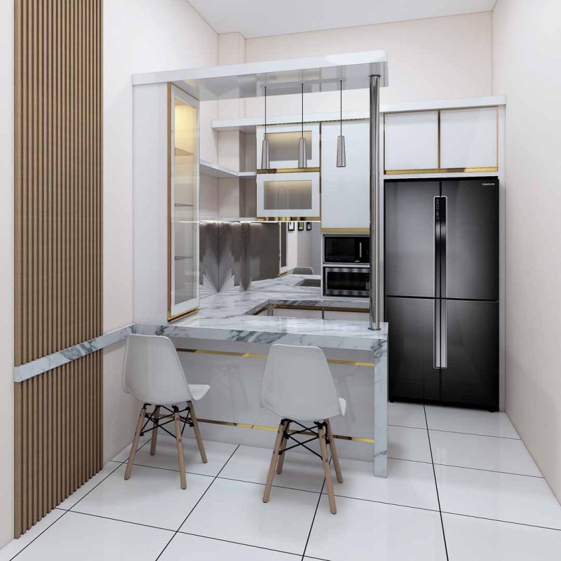 – Kitchen Set Peninsula: Kitchen set ini mirip dengan kitchen set island, tetapi satu sisi pulau terhubung dengan dinding atau kabinet.